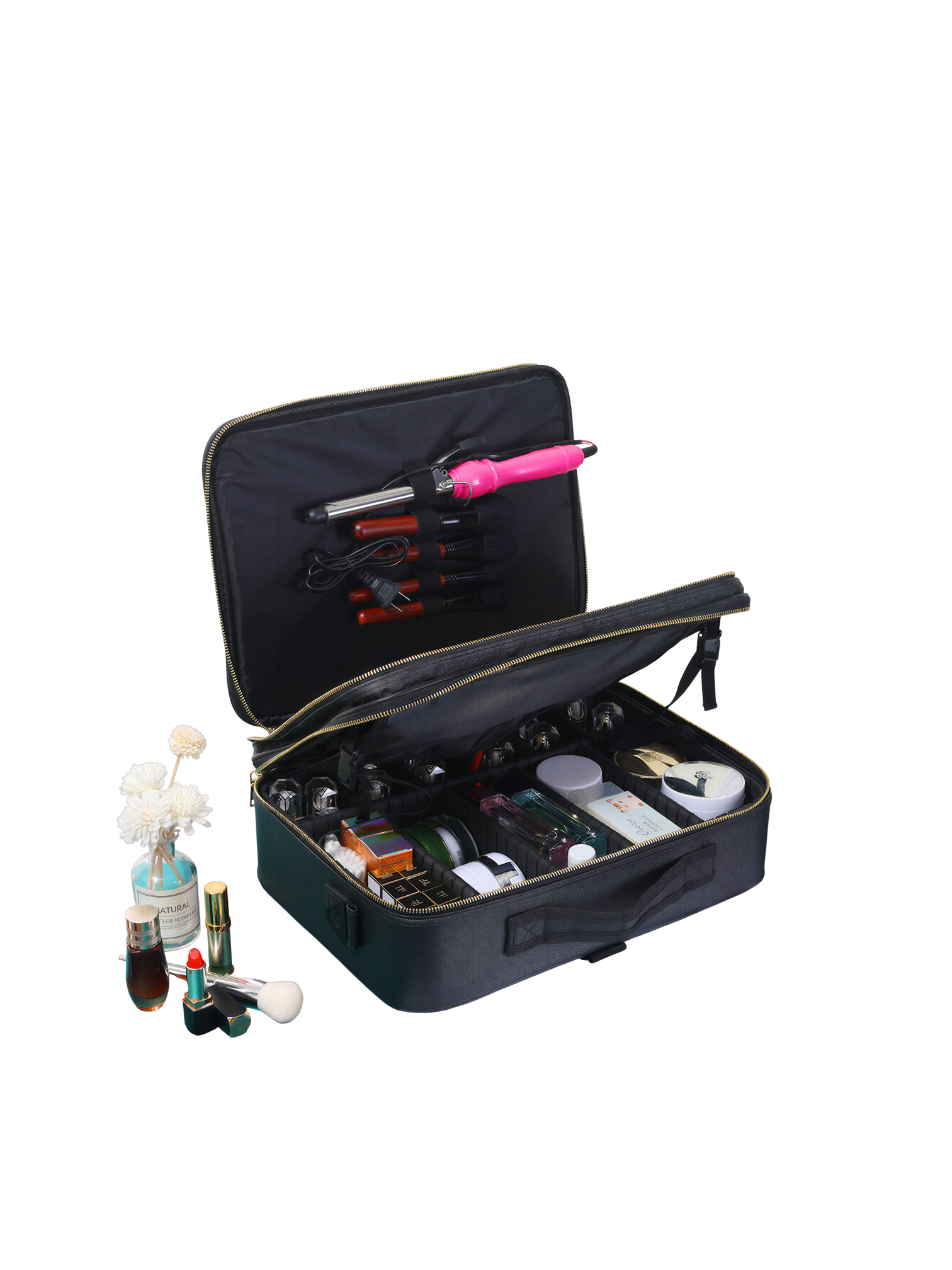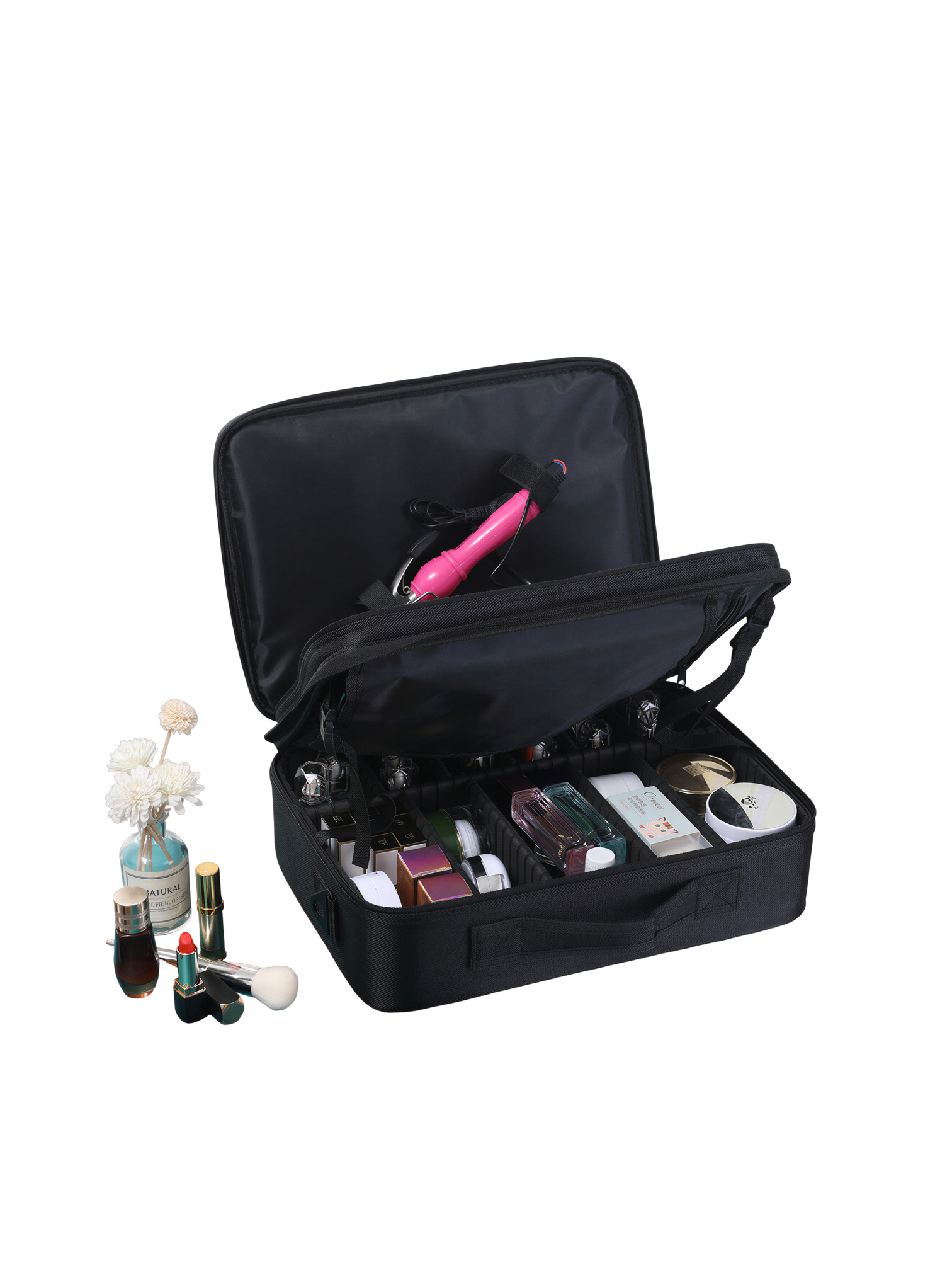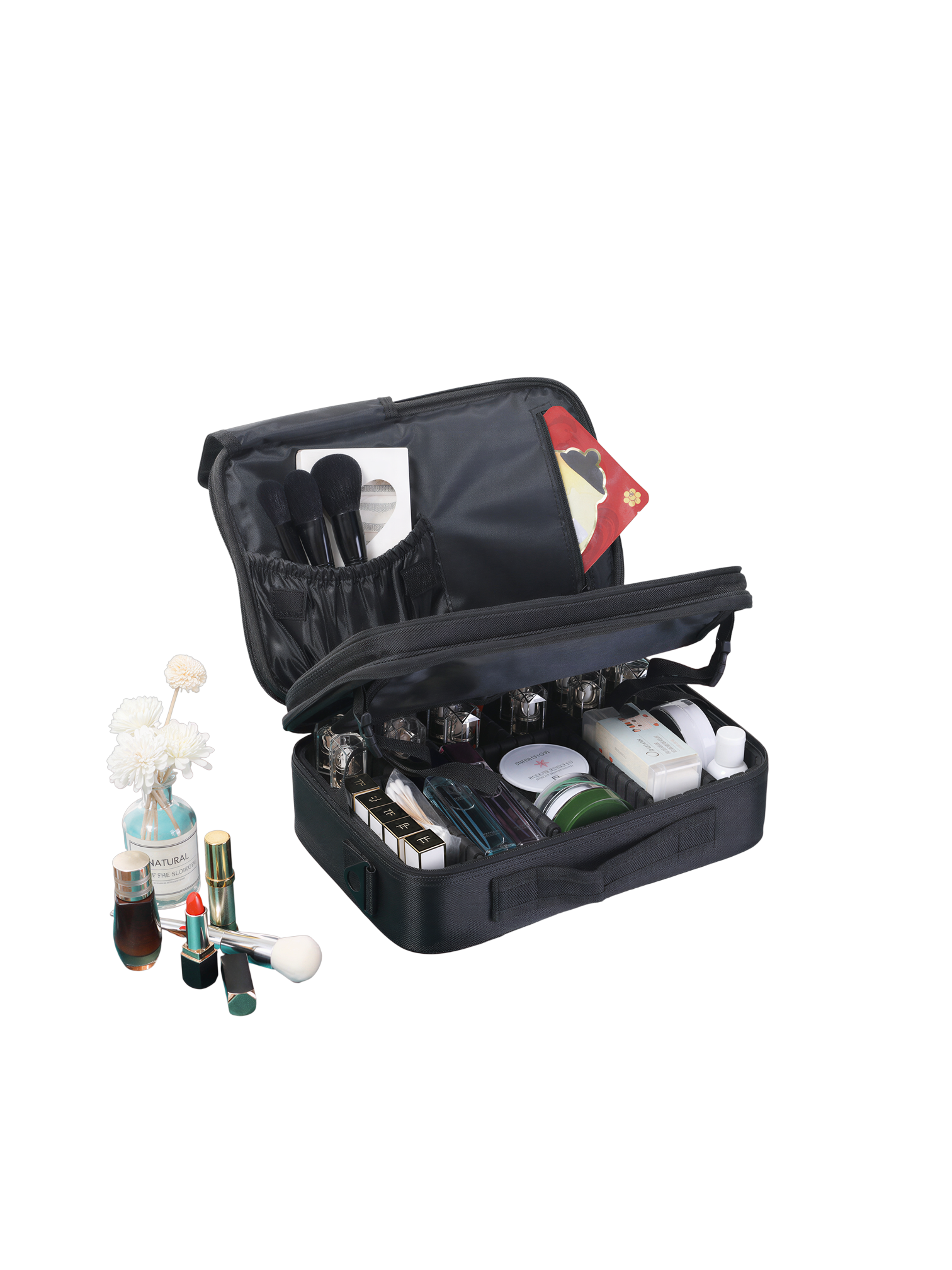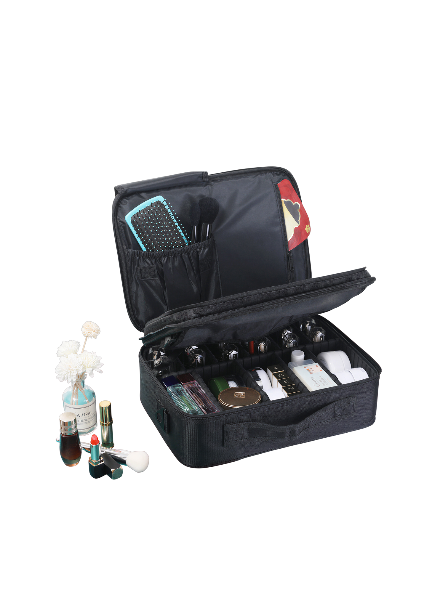 La conception ingénieuse de cette mallette offre une grande capacité de rangement tout en restant compacte. Son intérieur est pensé pour une classification efficace : le compartiment principal est doté de séparateurs ajustables et amovibles, vous permettant de personnaliser l’espace selon la taille de vos produits, des flacons aux palettes. La section supérieure est équipée de fentes élastiques dédiées pour vos pinceaux, avec un rabat protecteur pour les garder propres et en sécurité. Une poche latérale zippée offre un espace supplémentaire pour les masques, fonds de teint ou autres accessoires plats.