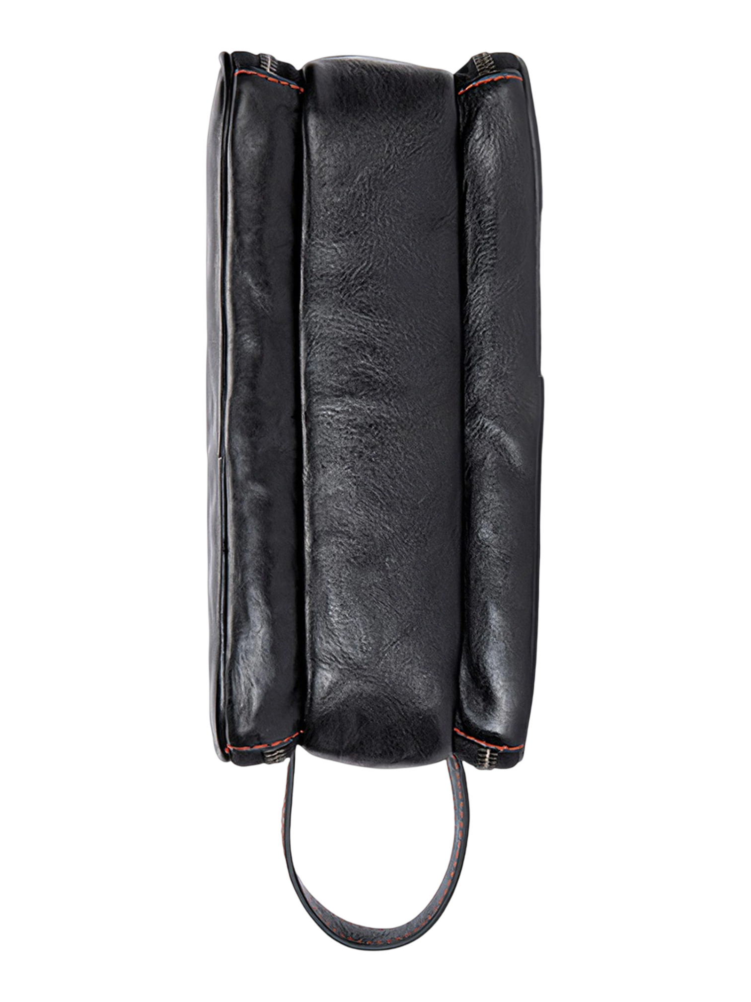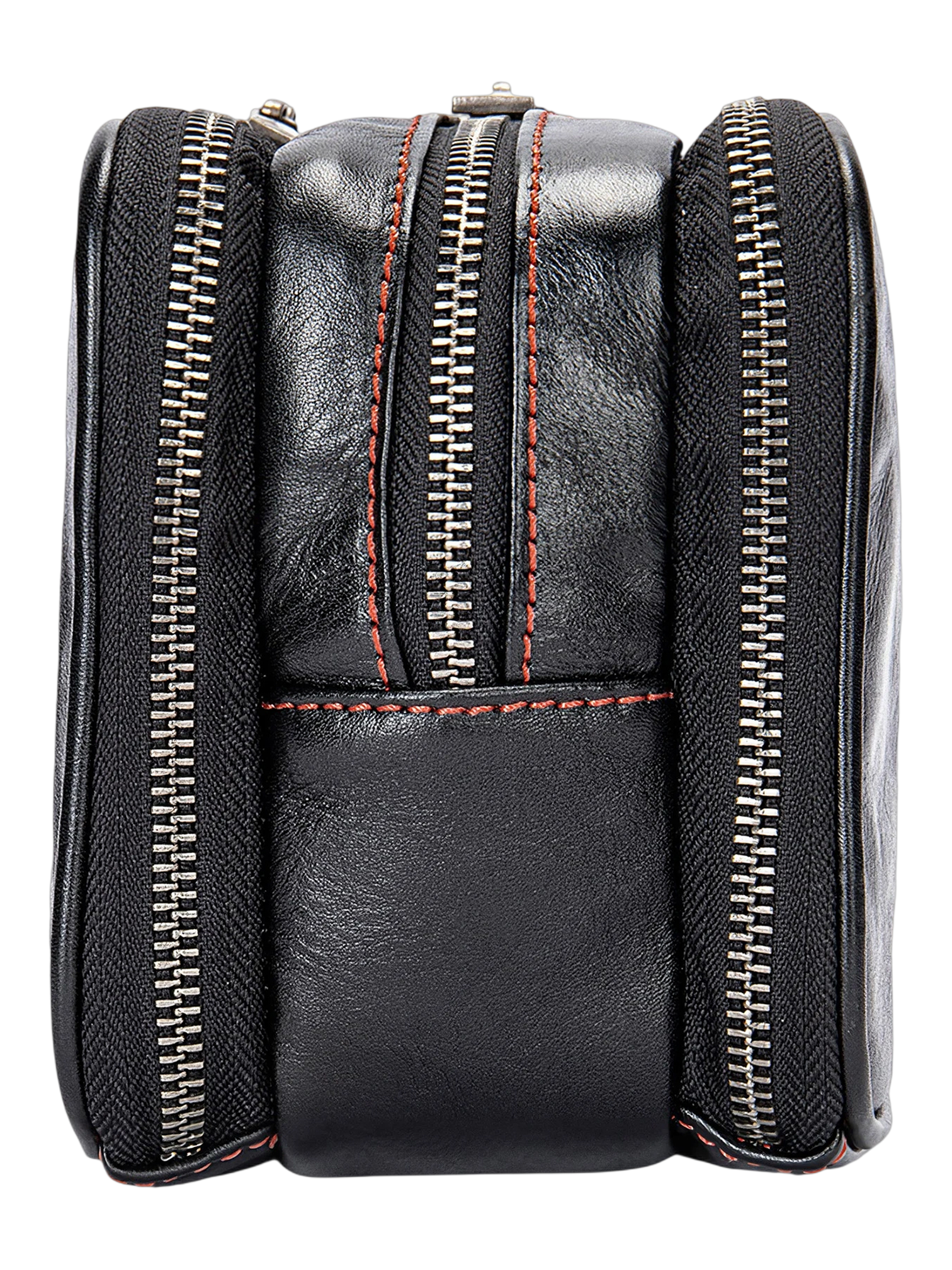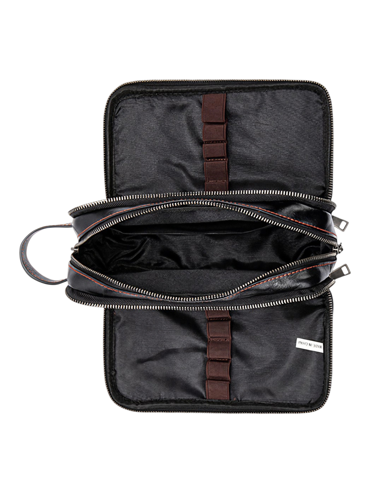 Offrez-vous cette trousse de toilette triple compartiment en cuir noir et cousue au fil rouge. Conçue pour répondre aux besoins d’organisation des hommes, cette trousse alliant style et praticité, vous permettra de transporter vos essentiels de toilette avec élégance.