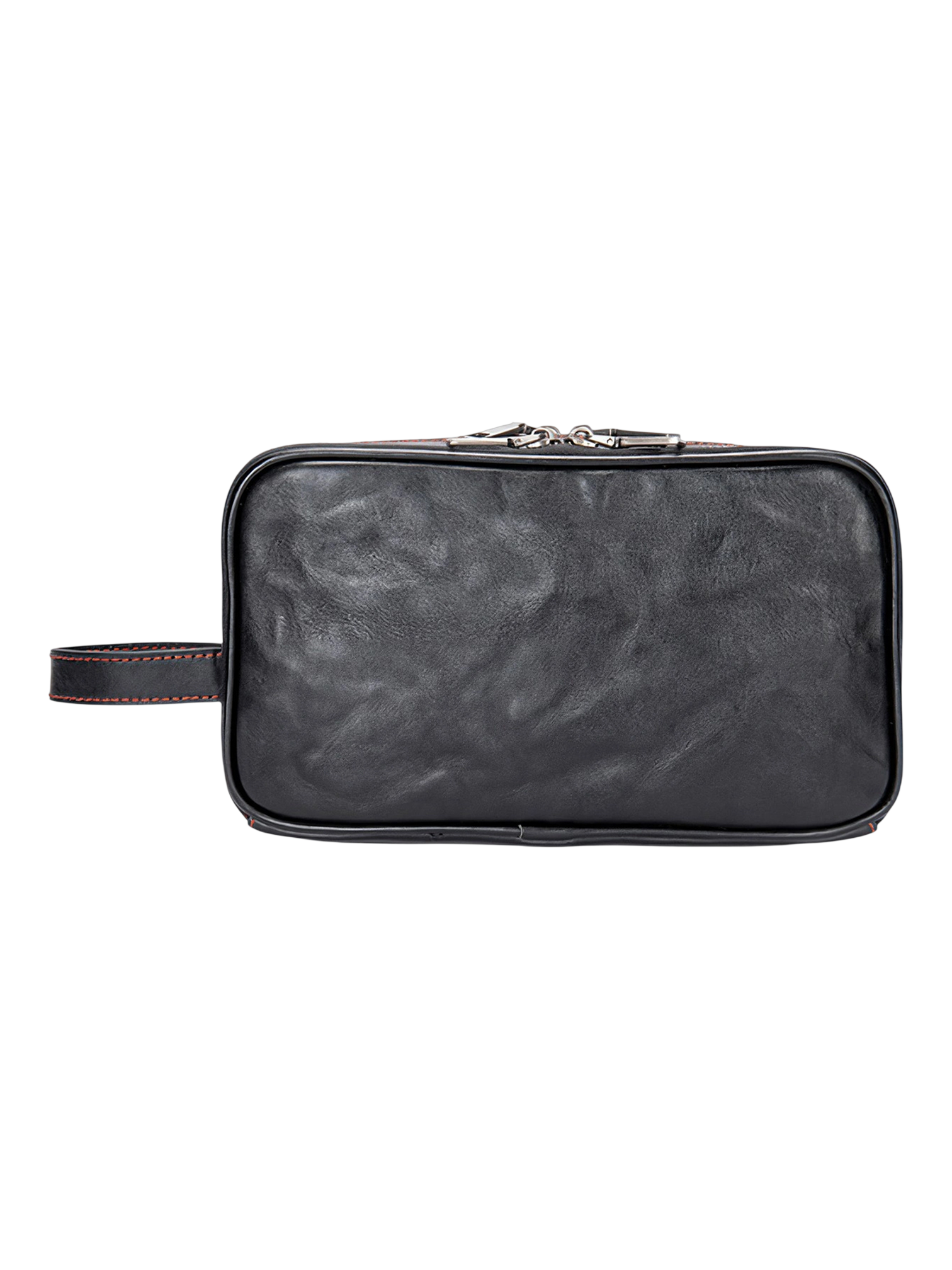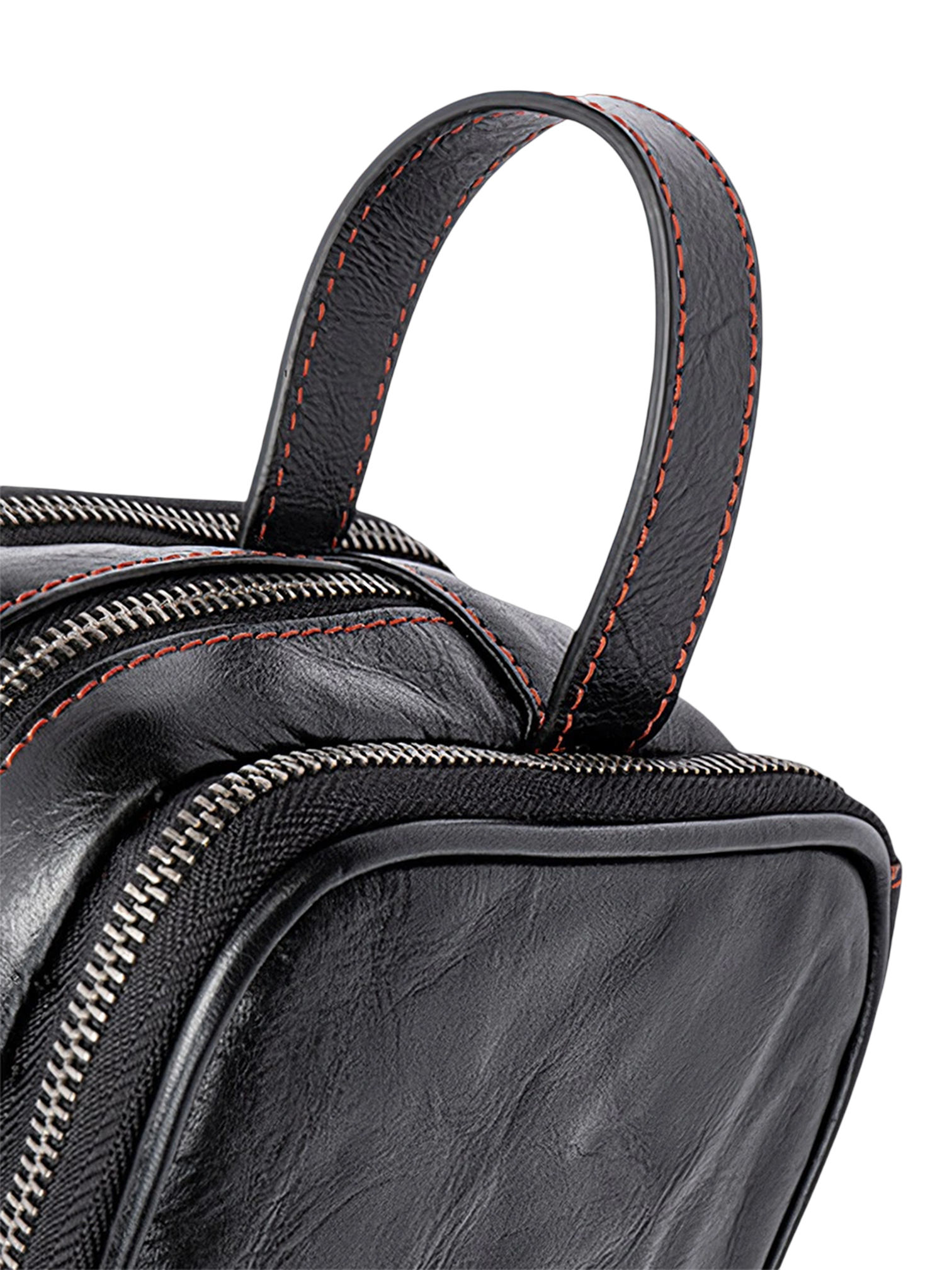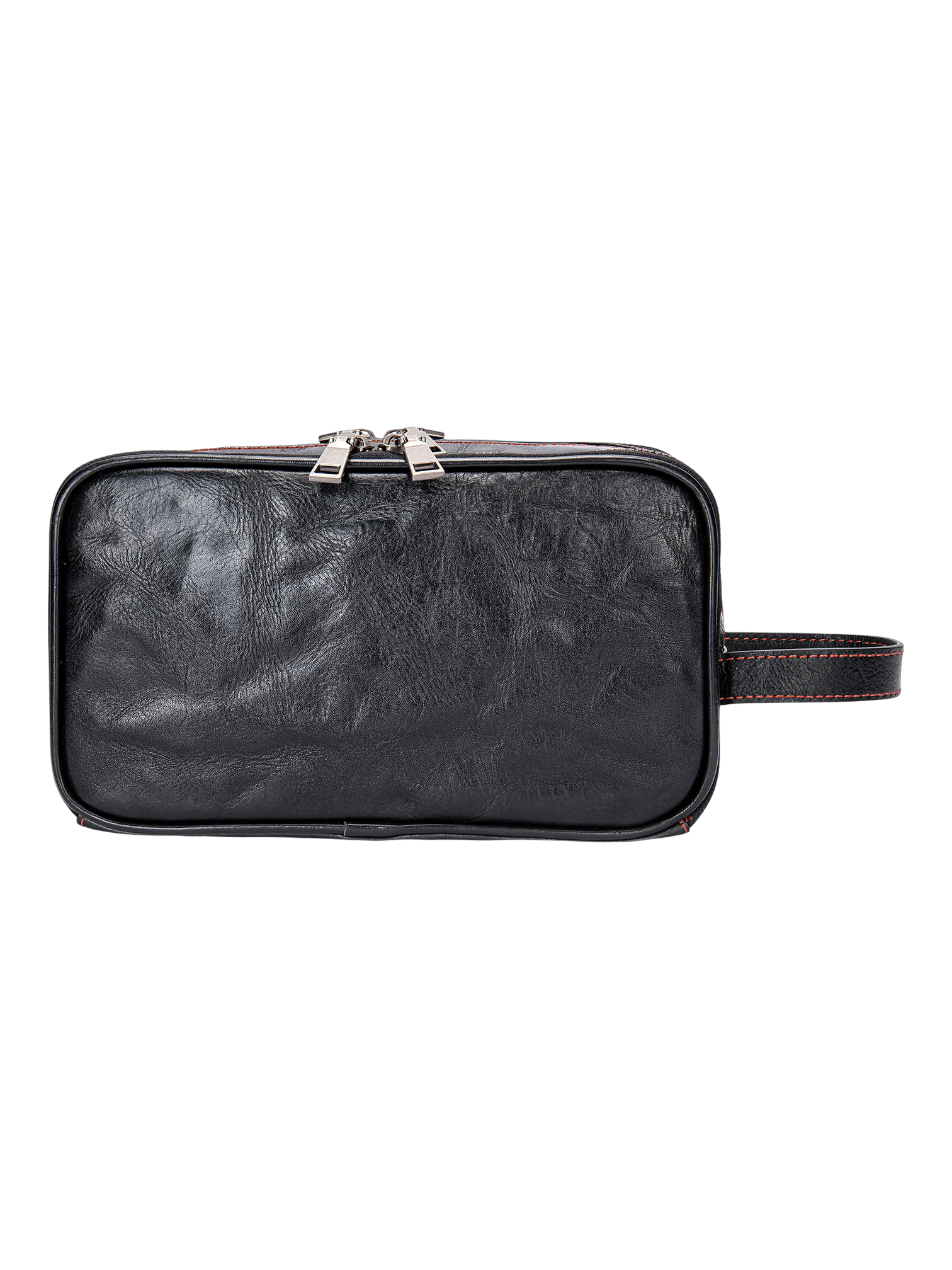 Offrez-vous cette trousse de toilette triple compartiment en cuir noir et cousue au fil rouge. Conçue pour répondre aux besoins d’organisation des hommes, cette trousse alliant style et praticité, vous permettra de transporter vos essentiels de toilette avec élégance.
