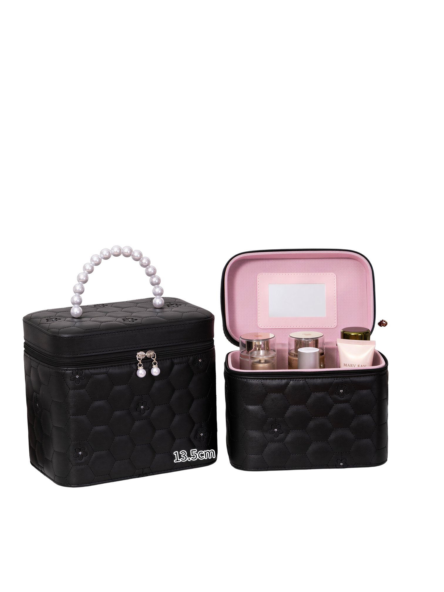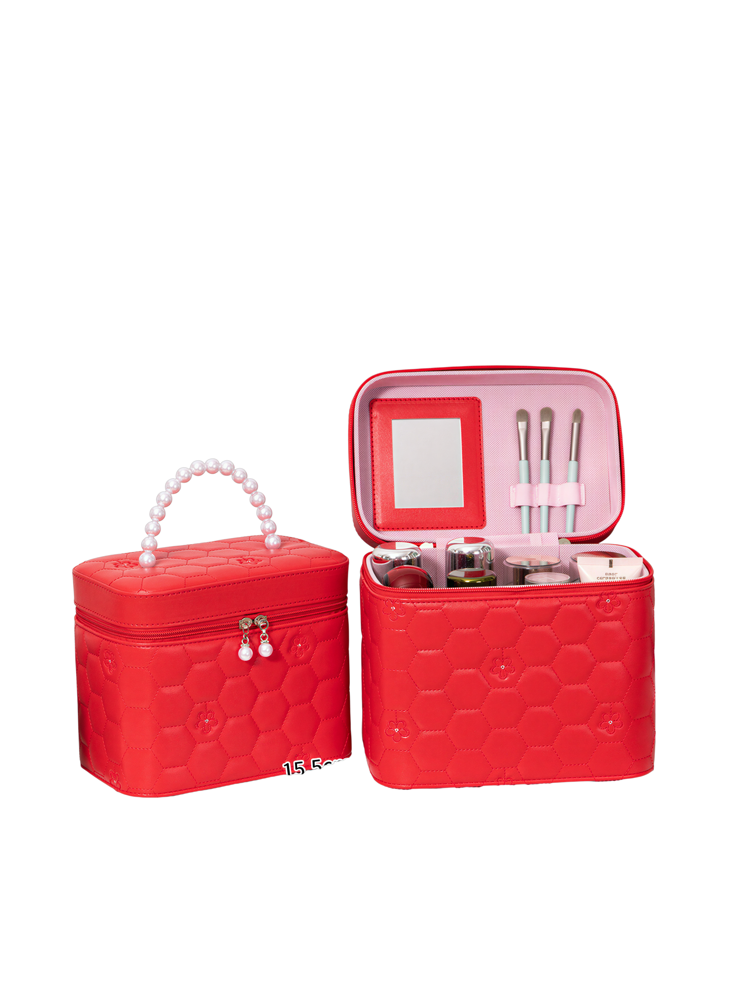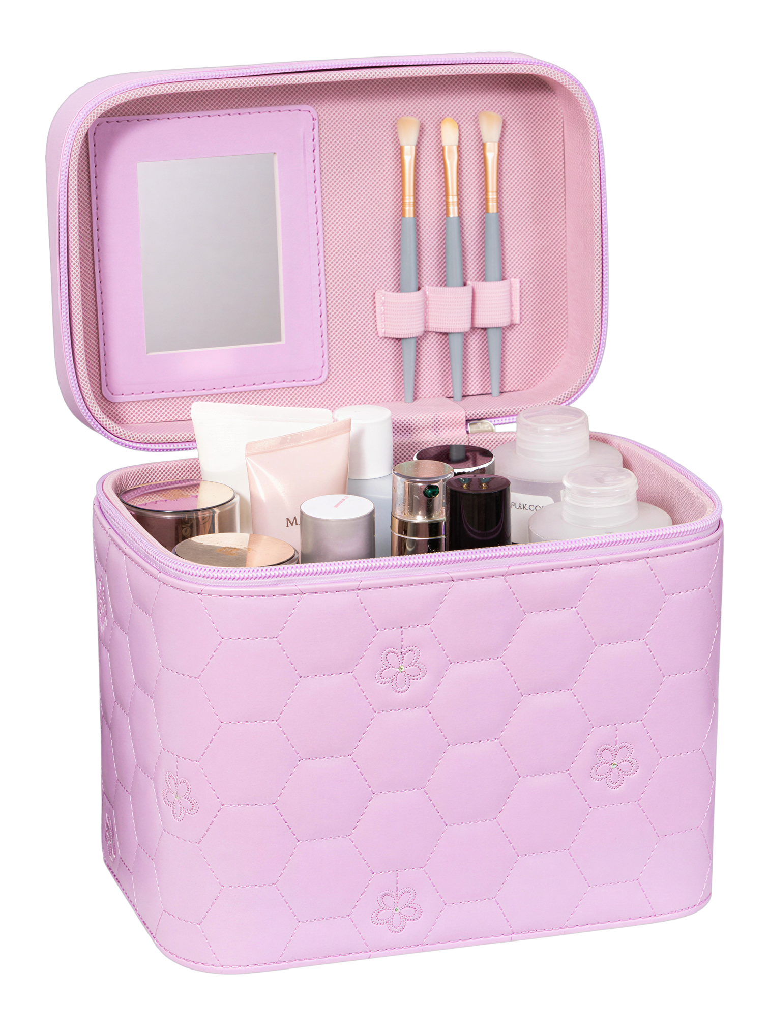 L’intérieur est pensé pour une organisation optimale. Un miroir intégré dans le couvercle vous permet de vous maquiller n’importe où, tandis que des porte-pinceaux et des fentes élastiques maintiennent vos outils en place. Le compartiment principal offre un espace généreux, capable d’accueillir des flacons et des pots de différentes tailles, jusqu’à environ 19 cm de hauteur pour les grands modèles.