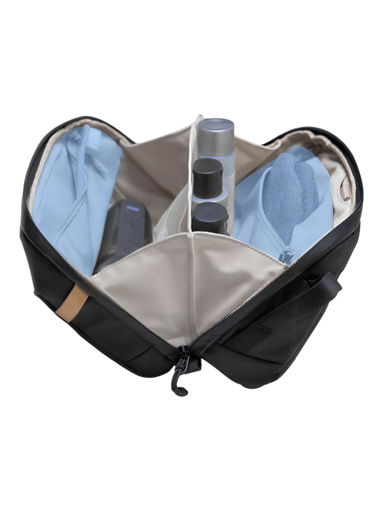 À l’intérieur, chaque zone a son rôle. Les brosses à dents et petits accessoires trouvent leur place à part, les flacons restent maintenus, et un espace dédié permet d’isoler les affaires humides du reste. C’est pratique après une douche, à la piscine ou en déplacement, quand vous voulez éviter qu’une serviette encore mouillée ou un accessoire humide ne touche vos produits secs.
