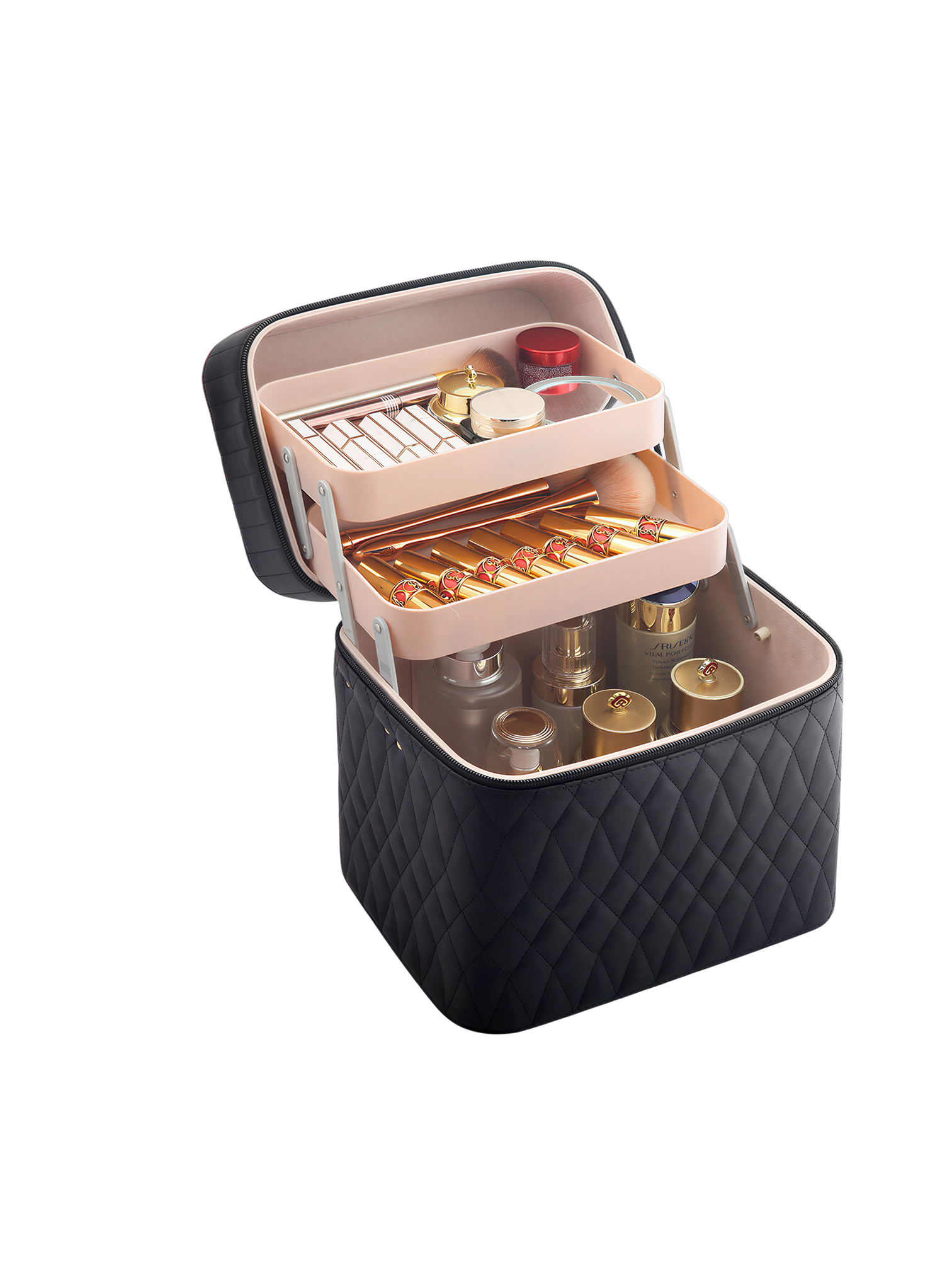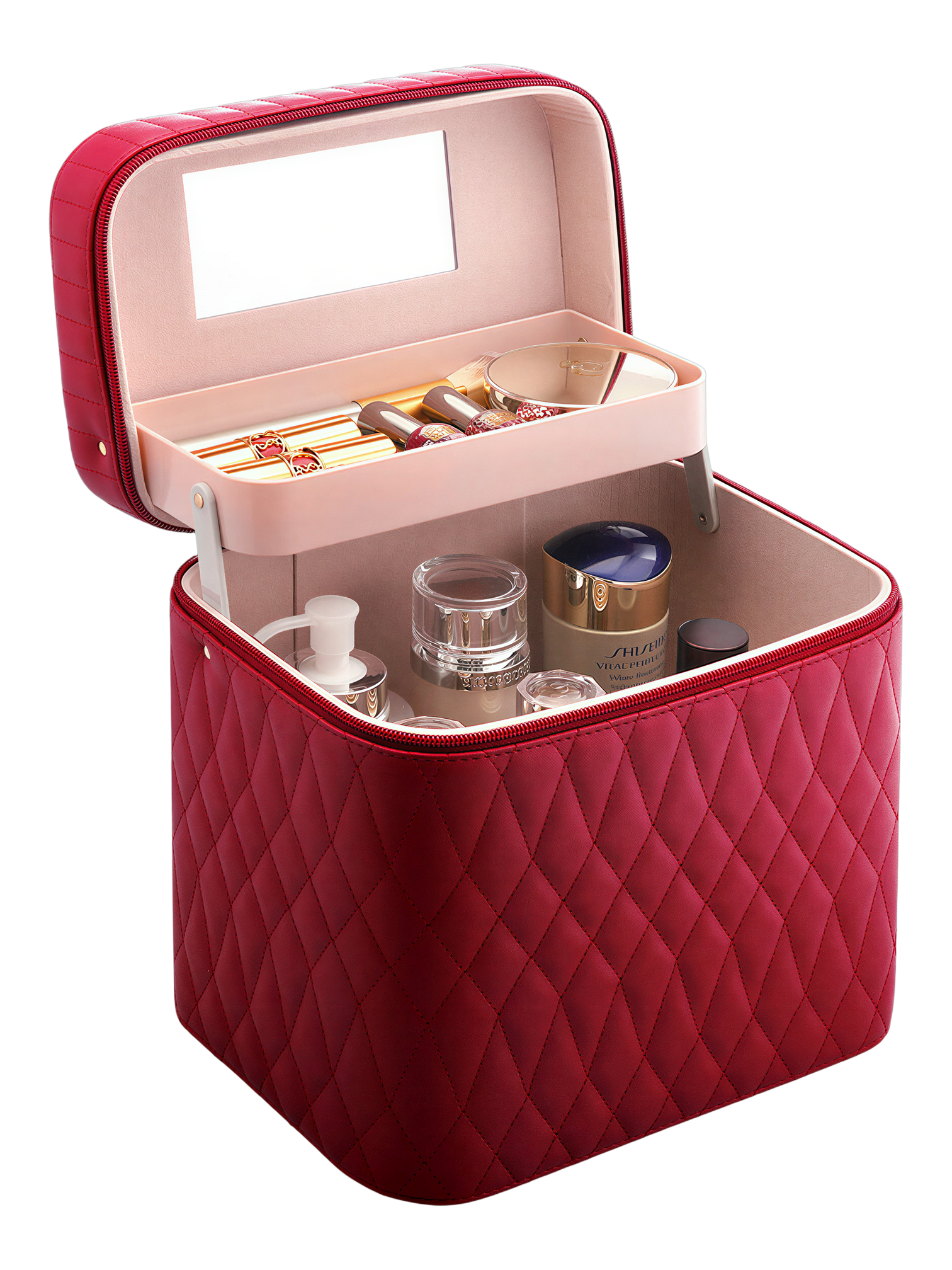 Son extérieur est en cuir synthétique, la couture en motif diamanté et matelassé donne un look unique à ce vanity case de maquillage. Disponible dans une palette de couleurs élégantes; noir, rose, vert ou rouge; il s’intègrera parfaitement et facilitera votre routine quotidienne.